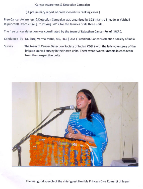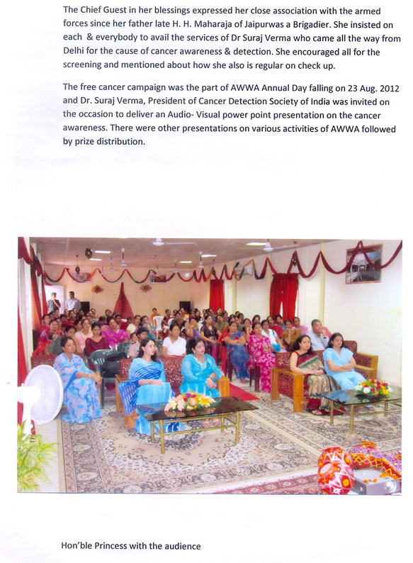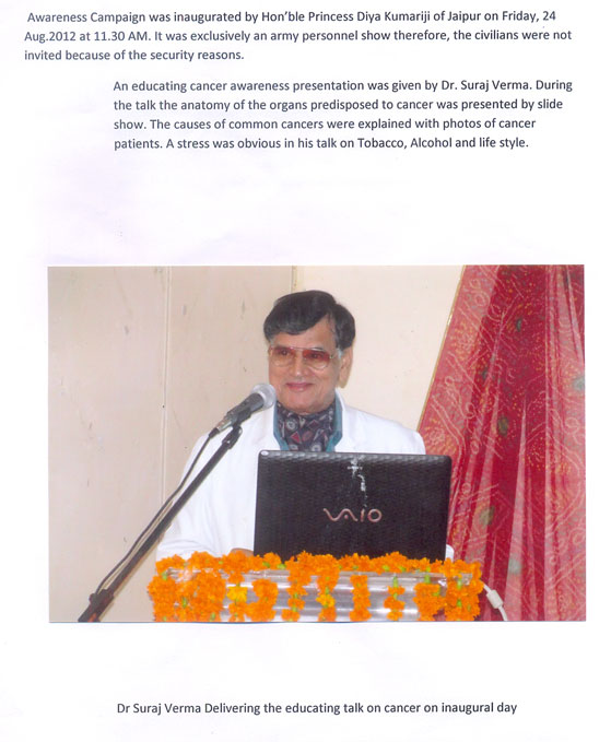 Slide Show talks on Cancer Awareness :- Chandra Arya Orphanage School, East of Kailash, New Delhi Tibet Medical College Dharamshala Army School Yol (Kangra), Himachal Pradesh |