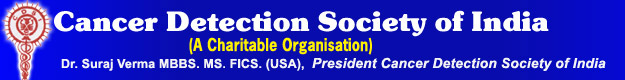 The Society was founded by Dr. Suraj Verma MBBS MS FICS (USA) registered on 3rd Jan, 1991 under the society ACT XXI--1860 NO-S/21603 The work is done and being done with the aims mentioned, "To control and contain cancer" by creating Awareness. A slide show Audio visual presentation is always organised followed by cancer detection camp. The isolated cases in these camps are further subjected to various diagnostic procedures there and then by Dr. Suraj Verma himself and subjects with confirmed diagnosis are then referred to various nearest Regional cancer centers (RCC) through our networking. The datas and findings of eachof these camps with photos are kept as confidential record with the Cancer Detection Society of India which is not available on this website. |