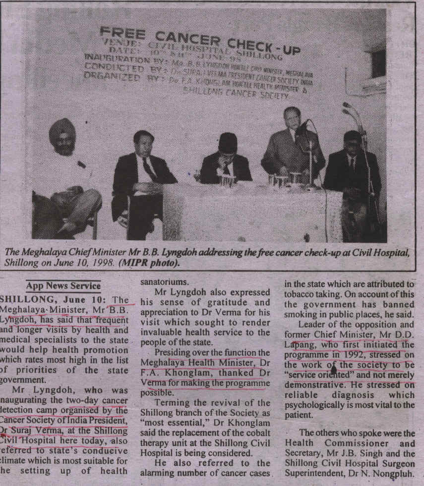 | 1998 | Free Cancer check-up camp at Civil Hospital inaugurated by Mr. B.B. Lyndo, Hon'ble Chief Minister. | ||